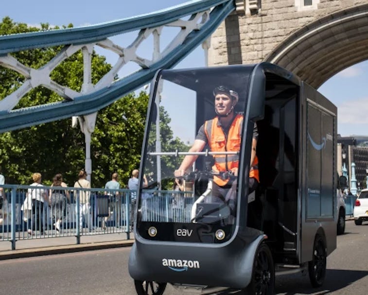 Low emissions for low-emissions zone — The initial fleet of cargo bikes will work in London’s Ultra Low Emission Zone, covering about 10 percent of its area. That’s a boon to Amazon’s pockets, too: gas-guzzlers are charged a fee for roaming those streets.