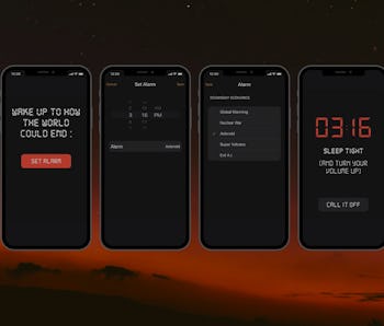 A customizable calamity — Co-created by Nass and Henningsen (the former of whom also had a hand in that anti-productivity Chrome extension), the alarm is pretty self-explanatory: Users pick from a number of different, genuinely plausible apocalyptic scenarios, opt for a designated wake up time, and then wait to be rousted by facts regarding each specific End Times situation. Current causes of mass extinction include a supervolcano, malignant artificial intelligence, asteroid strike, nuclear war, and, of course, good ol’ fashioned climate change.