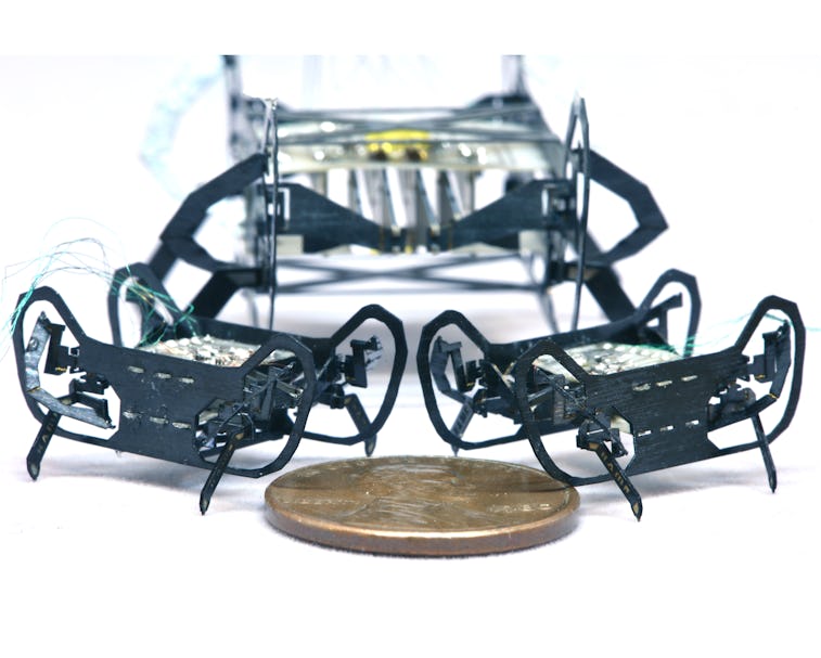 Tiny robots could also prove useful in tight spaces, like searching through rubble after earthquakes or other natural disasters, or helping with maintenance checks on vehicles, machinery, or anything else that isn't roomy enough — or is too hazardous for — humans' hands to explore. First, the researchers are going to have to figure out how to power the critters without wires though. But you can bet they're working on it.