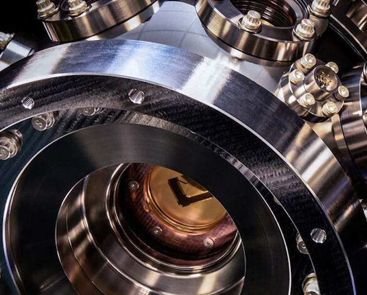 Honeywell’s quantum computer — The machine takes up quite a bit of real estate and looks like '80s popular culture imagined the future. An intense vacuum chamber — a basketball-sized stainless steel sphere — lets in laser light. Within the sphere, the vacuum has five times fewer particles than outer space. As is typical for quantum computers, it’s extremely cold — colder than the surface of Pluto, in fact, a frigid 10 degrees above absolute zero, or approximately negative 441 degrees Fahrenheit — thanks to liquid helium.