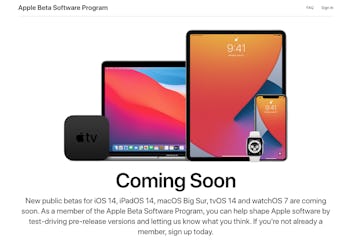 "New public betas for iOS 14, iPadOS 14, macOS Big Sur, tvOS 14 and watchOS 7 are coming soon," Apple says on the beta program website. "As a member of the Apple Beta Software Program, you can help shape Apple software by test-driving pre-release versions and letting us know what you think. If you’re not already a member, sign up today." If you sign up, once the beta is available you'll be able to install it on your device and offer feedback to Apple using the company's Feedback Assistant app.