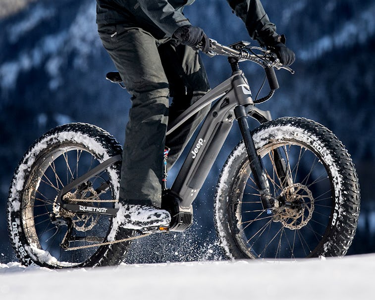 Behold the e-Bike — Known simply as the e-Bike, Jeep teamed up with QuietKat for its first foray into the field. A 750-watt electric motor gives the e-Bike a range of up to 40 miles on a single charge. The thick 4.8-inch tires and a Fire-Link suspension allow it to tackle extreme terrain. QuietKat, no stranger to electric bikes, touts it as "the most capable off-road electric mountain bike there is."