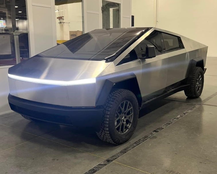 An actual vehicle — The photos, which appear to have been taken inside a Tesla facility, with some employees pictured, show a Cybertruck so similar to the original that only a discerning eye will catch the differences. Luckily the Tesla fanboys over at the Cybertruck Owners Club forum are quite discerning indeed.