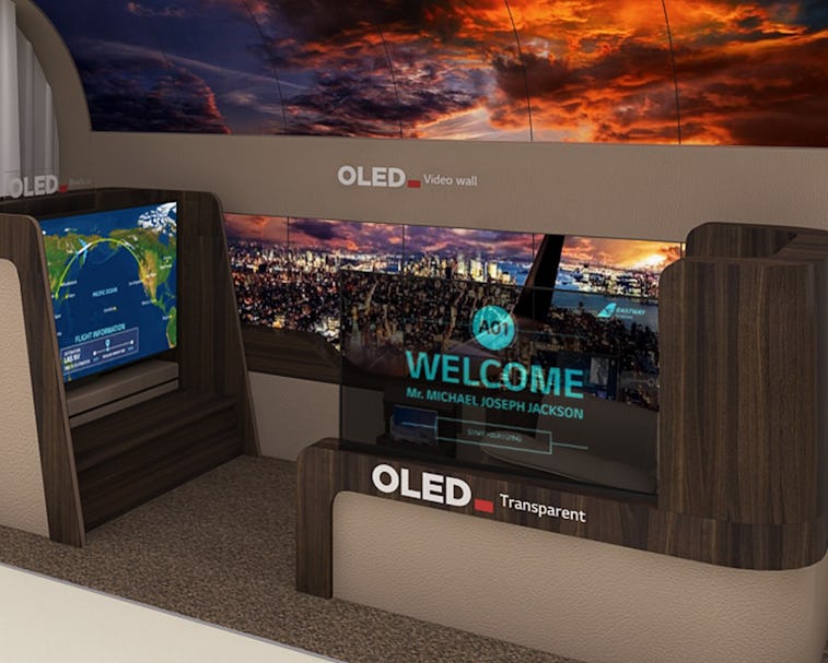 LG has unveiled new 55-inch flexible OLED displays it envisions will someday blanket the inside of airplane cabins. These displays could show things like clouds or some other peaceful scene during a flight — or probably advertisements if we’re being honest.