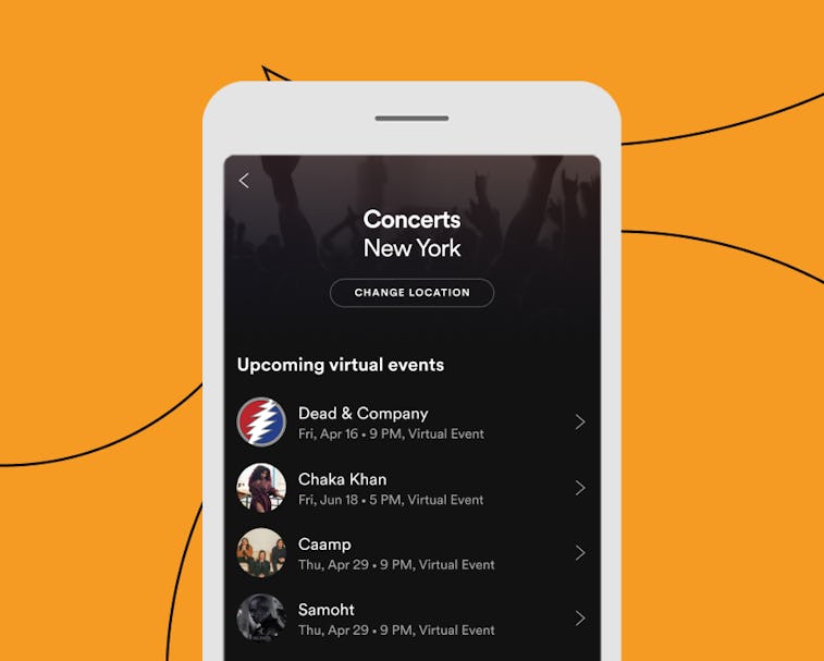 How do I watch? — If you're a Spotify user, you can access the live platforms’ catalogs of virtual events via Spotify's Concert tab. You should see various artists under the "On Tour" section on iOS, Android, and the regular desktop Spotify apps. The recommendation algorithm will sift through the genres, musicians, and moods you're into to offer up suitable recommendations.