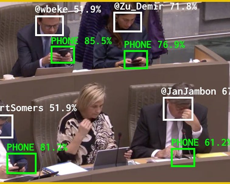 Depoorter’s project, which he has named “The Flemish Scrollers,” targets Belgian politicians in particular. Every meeting of the Flemish government is live-streamed via YouTube — so Depoorter realized he could use these streams to automatically tag distracted politicians (h/t TheNextWeb).